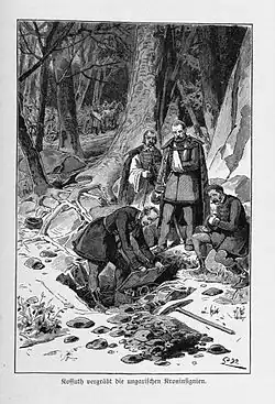 - 1848 brach am 15. März in Ungarn die Revolution los. Die Revolutionäre unter Lajos Kossuth bemächtigten sich der Stephanskrone, die für den nationalen Aufstand der Ungarn höchste symbolische Bedeutung hatte. Mit einem requirierten Eisenbahnwaggon wurde die Krone über die noch im Bau befindliche, aber schon provisorisch befahrbare Kettenbrücke vor den habsburgischen Truppen Richtung Osten in Sicherheit gebracht. Es war der erste Zug, der über die Kettenbrücke fuhr. Zuerst ging es mit der Eisenbahn bis nach Szolnok, dann weiter im Pferdewagen nach Debrezin. Nachdem sie für kurze Zeit nach Budapest zurückgebracht worden war, folgte eine neue Flucht. Diesmal wurde die Stephanskrone zuerst nach Szegedin, dann über Großwardein nach Arad gebracht. Dort wollte sich der Ministerpräsident Bertalan Szemere vergewissern, ob in der Transportkiste tatsächlich die Stephanskrone lag. Ähnlich wie der Sultan Suleiman vor ihm setzte er sich die Krone zur Probe aufs Haupt. Kurz darauf mussten die Revolutionäre jedoch weiter flüchten und kamen bis nach Orschowa im äußersten Südosten des Banats, im heutigen Rumänien. Dort vergruben sie die Kiste zuerst in einem Haus. Als sie jedoch erkannten, dass dies nicht unbemerkt geblieben war, suchten sie ein neues Versteck und vergruben die Krone in einem Wald nahe der Grenze zur Walachei.