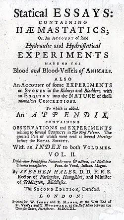 - Statical Essays: Containing Vegetable Staticks; Or, An Account of some Statical Experiments on the Sap in Vegetables. London 1738