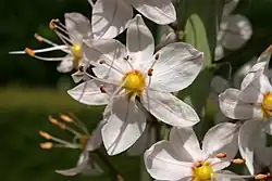 Die zwittrigen Blüten sind radiärsymmetrisch und dreizählig.[1] Die sechs, freien oder nur an ihrer Basis verwachsenen Blütenhüllblätter stehen glockenförmig, röhrig oder becherförmig zusammen. Die Blütenhüllblätter besitzen ein, drei oder fünf Nerven.[1] Es sind zwei Kreise mit je drei Staubblättern vorhanden. Die Staubfäden sind dünn oder verbreitern sich zu ihrer Basis hin. Die Staubbeutel sind dorsifix nahe ihrer Basis; diese Basis besitzt bis zu 0,5 Millimeter lange Anhängsel.[1] Drei Fruchtblätter sind zu einem oberständige, dreikammerigen Fruchtknoten verwachsen. Der relativ lange und dünne Griffel ist haltbar und auch noch bei der Frucht auffällig. Die Narbe ist sehr klein.[1]