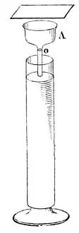 Das Stereometer von Say besteht aus einem Glasgefäß A, dessen eben geschliffener Rand durch eine Glasplatte luftdicht verschlossen werden kann; nach unten setzt sich dasselbe in eine offene, mit einer Teilung versehene Glasröhre fort, deren zwischen zwei Teilstrichen enthaltener Rauminhalt genau bekannt ist. Wird die Röhre, während A offen ist, in ein mit Quecksilber gefülltes Standgefäß bis zum Nullpunkt o der Teilung eingetaucht und die Glasplatte aufgelegt, so ist ein bestimmtes Luftvolumen v abgesperrt, dessen Druck durch den herrschenden Barometerstand b angegeben wird.