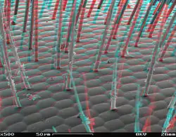 3D-Anaglyphenbild aus dem REM für Rot-Cyan-Brillen, Motiv: Bienenauge