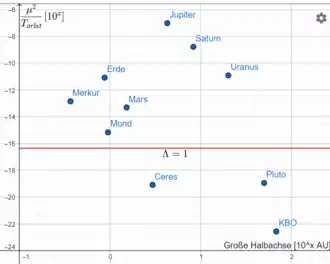 Mit Hilfe des Stern-Levison-Parameters Λ werden planetare Körper in der dynamischen Bedeutsamkeit für ihr Rotationssystem verglichen und so in Obere- bzw. untere Planeten unterschieden. Die Grenze verläuft bei Λ=1 (rote Horizontale). Zur Veranschaulichung werden einzelne Himmelskörper präsentiert.