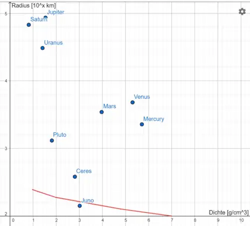 Minimaler Planetenradius in Abhängigkeit der Planetendichte in rot eingezeichnet. Y-Achse logarithmisch skaliert. Zu Veranschaulichung sind einige bekannte Himmelskörper präsentiert.