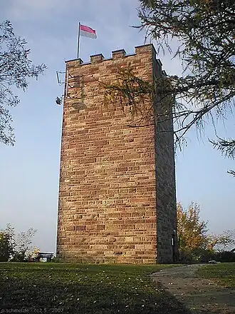 - Der Schlossbergturm, ein 14 Meter hoher Wasser- und Aussichtsturm in Sternenfels hat ein Fassungsvermögen von 150 Kubikmeter Wasser und wurde 1967 auf dem 375,4 m[11] hohen Schlossberg im Stile eines Bergfrieds erbaut.[12] Im Turm befindet sich auch eine Ausstellung zur Geschichte der Herren von Sternenfels und zur Geologie vom Stromberg und Heuchelberg.