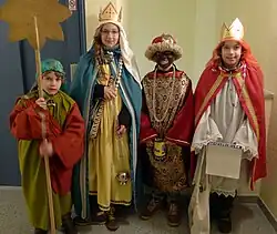 In manchen Regionen werden die Sternsinger traditionell in unterschiedlichen Hautfarben geschminkt, um so die im Mittelalter aufgekommene Vorstellung der unterschiedlichen Herkunft der drei Könige zu symbolisieren.[29] Mitunter wird dieser Brauch auch darauf reduziert, einen der Sternsinger schwarz zu schminken. Ob es sich bei dem dunkelhäutigen König um Caspar, Melchior oder Balthasar handelt, wird nicht einheitlich gehandhabt. In den Legenden galt seit dem 9. Jahrhundert zunächst überwiegend Kaspar als „Mohr“, später Melchior, der auch als vornehmster der drei Weisen angesehen wurde.[30]