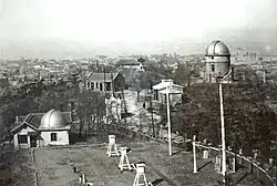 Nach dem Juye-Vorfall, bei dem in der Nacht vom 1. auf den 2. November 1897 zwei deutsche Missionare ermordet wurden, wurde Qingdao am 14. November 1897 von deutschen Truppen besetzt. Am 6. März 1898 wurde mit der chinesischen Regierung ein Vertrag über die Pacht der Jiaozhou-Bucht über 99 Jahre abgeschlossen. Das „Deutsche Pachtgebiet Kiautschou“ war nicht der Kolonialabteilung des Auswärtigen Amtes, sondern dem Reichsmarineamt unterstellt.[52][53] Bei der Kaiserlichen Marine war man sich über das problematische Monsunklima in Asien völlig im Klaren. Schon als das Kanonenboot Iltis am 23. Juli 1896 bei Rongcheng während eines Taifuns gestrandet war und dabei 71 Seeleute ums Leben kamen, herrschte dort die Ansicht, dass einer der Gründe für das Unglück der Mangel an genauen Wettervorhersagen war. Nach mehrmonatigen Planungsarbeiten wurde nun in Qingdao am 14. Juni 1898 die Meteorologisch-Astronomische Station (气象天文测量所) eröffnet, die zusammen mit dem Hafenamt vom Adjutanten des Gouverneurs (damals Kapitän zur See Carl Rosendahl) geleitet wurde.[54][55][56] 1905 wurde das ursprünglich in der Guantao-Straße (馆陶路) im Stadtbezirk Shibei beheimatete Observatorium an seinen heutigen Standort auf dem 79 m hohen Observatoriumsberg (观象山, ursprünglich „Wasserberg“ bzw. 水道山 genannt) im Norden des Stadtbezirks Shinan verlegt.[57] 36° 4′ 10,9″ N, 120° 19′ 22,5″ O