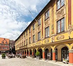 Bei der Errichtung war das Gebäude einstöckig und hatte 20 Rippenbögen. 1522/63 wurden drei Bögen an der rechten Seite des Hauses abgebrochen, um dem Rathaus einen würdigeren Rahmen zu geben. 1708 wurde es um ein Stockwerk erhöht. Zu seiner Entstehungszeit war es ein profaner unverputzter Ziegelbau. Die heutige neubarocke Bemalung konnte 1909 aufgrund des Vermächtnisses der Bürgermeisterswitwe Rosa von Zoller vollendet[1] und mit einer gemalten neubarocken Stadtansicht in der Mitte des Gebäudes versehen werden. Es verbindet den Rathausvorplatz mit dem westlichen Fischmarkt.