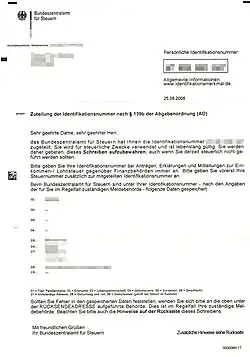 Die steuerliche Identifikationsnummer[1] (IdNr. oder auch Steuer-IdNr.) ist eine bundeseinheitliche und dauerhafte elfstellige Identifikationsnummer von in Deutschland gemeldeten Bürgern für Steuerzwecke.