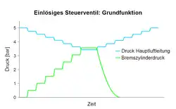 Eine Druckverminderung in der Hauptluftleitung 2 bewirkt eine Abnahme des Drucks im Raum (blau) über dem Steuerkolben 7. Gleichzeitig schließen die Rückschlagventile 5 und 6. Somit kann weder aus dem Hilfsluftbehälter noch aus dem Steuerbehälter Druckluft in die Hauptluftleitung zurückströmen. Infolge des Druckunterschieds zwischen der Steuerluft (gelb) und der Hauptluftleitungsluft (blau) hebt sich der Steuerkolben, dessen Stößel das Einlassventil von seinem Sitz abhebt und öffnet. Die Verbindung des Bremszylinders 4 durch die Bohrung des Ventilstößels ist geschlossen und aus dem Hilfsluftbehälter strömt Druckluft (grün) durch das geöffnete Einlassventil 10 in den Bremszylinder.
