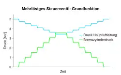 Pneumatische Steuerventile arbeiten in der Regel nach dem sogenannten Dreidruckprinzip. Gesteuert werden der Hauptluftleitungsdruck (blau), der Druck im Steuerbehälter (gelb) und der Druck im Bremszylinder (grün). Der Druck im Hilfsluftbehälter (rot) enthält den Luftvorrat zur Speisung des Bremszylinders.
