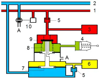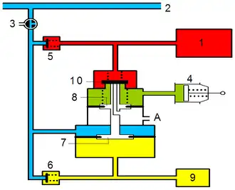 - über das Rückschlagventil 6 in den Steuerbehälter 9 und in den Raum (gelb) unter dem Steuerkolben 7.