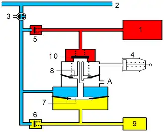 Beim Bremsen wird durch die Zerstörung des Unterdrucks in der Hauptluftleitung der Kolben des Steuerventils nach oben bewegt. Im Steuerbehälter 6 bleibt das Referenzvakuum von 52 cm Hg durch schließen des Rückschlagventils erhalten. Druckluft strömt aus der Speiseleitung 1 durch das geöffnete Einlassventil 9 in die Kammer über dem Regulierkolben 8 und in den Bremszylinder.