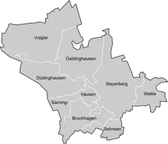 Am 1. März 1974 wurden die Gemeinden Bruchhagen, Deblinghausen, Düdinghausen, Sarninghausen, Sehnsen, Voigtei und Wellie eingegliedert.[5]