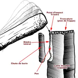 - prismatischer Stichel (hergestellt aus einer dicken Klinge, die durch mehrere parallele und lange Stichelbahnen definiert wird)