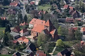 Stift (weiße Gebäude) und Stiftskirche aus der Vogelperspektive