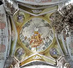 In den Gewölben und an den Schildwänden des Mittelschiffs befinden sich in dem stuckfreien Flächen Fresken von Josef Ferdinand Fromiller. Zum Teil stammen sie auch aus seiner Werkstatt, was die unterschiedliche Qualität erklärt. Der Chor enthält im Gewölbe die Darstellung des Auge Gottes, an der Südwand Vermählung Mariä, an der Nordwand Mariä Heimsuchung. Die Vierung zeigt im Gewölbe die Scheinarchitektur einer gemalten Kuppel, darin Gottvater und Heiliger Geist. An den Wänden sind Christi Geburt und Anbetung der Könige dargestellt.[4]