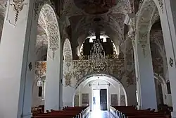Das vierjochige und dreischiffige Langhaus hat ein 5,50 m breites Mittelschiff. Dieses ist doppelt so hoch wie breit. Zu den Seitenschiffen hin gibt es breite, hohe Arkadenöffnungen. Die Pfeiler sind im Kern romanisch und wurden bei der Barockisierung der Kirche deutlich erhöht, erhielten zum Mittelschiff hin zarte Pilastergliederung. Die Mittelschifftonne hat Stichkappen, in den Seitenschiffen gibt es ein verschliffenes Kreuzgratgewölbe. Die Westempore ist gemauert und umfasst alle drei Schiffe. Sie ist kreuzgratunterwölbt. Zu den Schiffen hin öffnet sie sich mit je einer Bogenöffnung.[3]