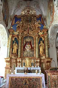 Der Hochaltar stammt aus dem letzten Viertel des 17. Jahrhunderts und wurde 1683 aus Maria Elend im Rosental nach Ossiach gebracht. Er ist mit einer Triumphbogenarchitektur ausgestattet. Er besitzt ein hohes Sockelgeschoß mit Opfergangportalen. Darüber befindet sich die dreiachsige, konkave Hauptzone. Über dem Mittelteil erhebt sich ein Segmentgiebel, der von einer Akanthus-Kartusche gekrönt ist. In Rahmen befindet sich unter einem Stoffbaldachin eine Thronende Madonne aus dem 17. Jahrhundert. Ihr zur Seite befinden sich lebensgroße Statuen der Heiligen Benedikt und Scholastika. Das Aufsatzbild zeigt die Verkündigung Mariae.[3]