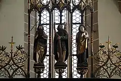 Den Altarauszug bildet ein Gesprenge mit Plastiken von Johannes dem Täufer, Christophorus und Laurentius. So ist der Altar jedoch erst seit der Renovierung im späten 19. Jahrhundert gestaltet. Steche beschrieb ihn 1886 noch als „seiner ursprünglichen Umrahmung und Bekrönung beraubt“.[33] Demnach ist nicht sicher, ob die drei Heiligen ursprünglich zu dem Marienaltar von 1513 gehörten.