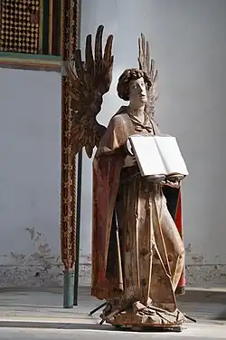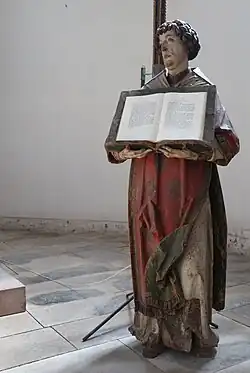 Die beiden aus Holz geschnitzten Pulthalterfiguren, ein Diakon und ein Engel, sind einzigartig. Die ohnehin seltenen anthropomorphen, das heißt menschengestaltigen Pulte für die liturgischen Lesungen im Gottesdienst kommen im Mittelalter fast ausschließlich als aus Stein hergestellte Einzelfiguren in Gestalt eines Diakons vor, die auch als Atzmann bezeichnet werden, während Pultengel sonst vor allem aus der Barockzeit bekannt sind.[41] Die beiden lebensgroßen Figuren mit ihren individuellen Gesichtszügen und ihrer fein nuancierten Mimik zählen zu „den ausdrucksvollsten Plastiken der deutschen Spätgotik überhaupt“.[42] Die (beim Blick zum Altar) rechte Figur, der Diakon, steht auf der Seite, auf der traditionell die Epistel gelesen wird. Ihm gegenüber auf der Evangelienseite steht der Engel, dessen verklärter Blick gen Himmel gerichtet ist. Auf seinem Pult stand das Evangelistar. Beide Figuren entstanden vermutlich wie der Hauptaltar um 1513. Die originale farbige Fassung ist fast völlig erhalten.[43]