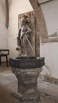 In der Kirche befinden sich zwei Taufbecken. Vor dem Altar steht ein großer Taufstein mit farbigem Blendmaßwerkschmuck aus dem 15. Jahrhundert. Von etwa 1540 ist der etwas kleinere sechseckige Taufstein im Übergang zum Turmraum, der eine Zeit lang Taufkapelle war. Er hat einen zinnernen Aufsatz mit integrierter Taufschale, in den rings um die Taufschale und am äußeren Rand umgeben von zwei Friesen kleiner Putten runde Medaillons mit Abbildungen christlicher Tugenden nach Vorlagen von Peter Flötner eingearbeitet sind.[48]