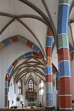 Im Inneren fällt durch die Überschneidung des östlichen Mittelpfeilers des Langhauses mit dem Triumphbogen die Asymmetrie auf, während sich das Westportal auf einer Achse mit dem Chor befindet. Das südliche Seitenschiff ist viel schmaler als das Hauptschiff. Chor und Langhaus sind eingewölbt. Das Netzgewölbe im Chor hat weder Schlusssteine noch Konsolen, während beim Kreuzrippengewölbe im Langhaus kleine Konsolen mit verschiedenen Figuren und vergoldete Schlusssteine vorhanden sind. Die Säulen und Gewölberippen des Langhauses sind dem ursprünglichen Aussehen entsprechend mehrfarbig gestaltet. Das neugotische Maßwerk der meisten Fenster stammt von der Restaurierung von 1882 bis 1887. Einige farbige Glasscheiben in den Chorfenstern sind aus dem frühen 16. Jahrhundert erhalten.[28] In den baulichen Details und in der Farbgestaltung besteht eine deutliche stilistische Nähe zur St.-Jakobi-Kirche in Chemnitz.[3] In die Nordostwand des Chores ist eine mit einem schmiedeeisernen Gitter versehene Sakramentsnische eingefügt.