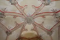 Nördlich an den Chor angebaut ist die Sakristei mit einem einfachen Tonnengewölbe. Hier haben sich einige gotische Wandmalereien erhalten, wie Darstellungen des heiligen Christophorus, eines Bischofs und über dem Portal des Schweißtuchs der Veronika.[30] Von der Sakristei führt der Aufgang zur Kanzel an der Nordostecke des Langhauses durch einen Mauerdurchbruch.