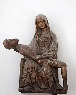 Auf etwa 1420/30 und damit hundert Jahre jünger als die Sitzmadonna werden ein Vesperbild oder Pietà und eine Marmorfigur des Kirchenvaters Hieronymus datiert. Das hölzerne Vesperbild an der Südwand des Chores zeigt Maria mit gramzerfurchtem Gesicht, ihren toten Sohn ausgestreckt auf dem Schoß. Der Kirchenvater sitzt als Gelehrter an einem Tisch, neben ihm der Löwe, dem er der Legende nach einen Splitter aus dem Fuß zog. Dieser Hieronymus wird aufgrund seiner weichen Gesichtszüge stilistisch nach Burgund verortet. Es wird angenommen, dass der Patronatsherr, Ritter Dietrich von Harras auf Schloss Lichtenwalde, die Skulptur von einer seiner Reisen, die er im Auftrag Kaiser Friedrichs III. unternahm, mitbrachte und der Kirche schenkte.[39] Diese Figur steht in der Nordkapelle.
