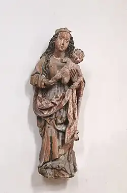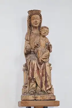 Links vom Altar an der Nordwand des Chores befindet sich die kleine thronende Madonna, bei der es sich vermutlich um das Gnadenbild der Wallfahrt handelte. Sie wird aufgrund des „archaischen Lächelns“ und des im 13. Jahrhundert verbreiteten Typus der Sitzmadonna teilweise als aus dem späten 13. Jahrhundert stammend angesehen,[37] in neuerer Zeit jedoch wegen des weichen Faltenfalls meist auf etwa 1320 datiert und damit nicht mehr der Romanik, sondern der Frühgotik zugeordnet.[38] Maria hält in der Rechten einen kleinen Vogel, während sie mit der Linken das mit übergeschlagenen Beinen auf ihrem Schoß sitzende Jesuskind stützt, dessen vermutlich zu einer Segensgeste erhobene rechte Hand verloren ist. Von der ursprünglichen Bemalung der Plastik sind nur Reste erhalten.