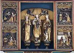 - ↑ Zur Konstruktion von Flügelaltären insgesamt siehe Karl-Werner Bachmann, Géza Jászai, Friedrich Kobler, Catheline Périer-D’Ieteren, Barbara Rommé, Norbert Wolf: Flügelretabel. In: Reallexikon zur Deutschen Kunstgeschichte. 9: Firstbekrönung – Flügelretabel.. C. H. Beck (in Kommission), München 2003, ISBN 3-406-14009-2, Sp. 1450–1536 (rdklabor.de).