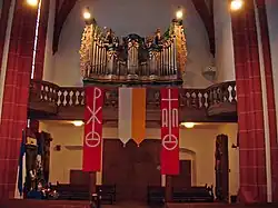 1935 baute man im hinteren Bereich des katholischen Kirchenteils eine aufgekaufte, barocke Empore aus Rheinsheim ein und installierte darauf die Walcker-Orgel, verblendet mit einem Barock-Prospekt des Orgelbauers Johann Ignaz Seuffert von 1788, ebenfalls aus der Kirche von Rheinsheim/Baden, die 1893 in Mechtersheim aufgestellt worden war.[29]