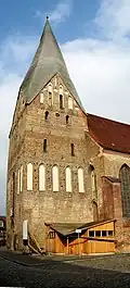 Der Kirchturm stammt vermutlich noch aus der zweiten Hälfte des 13. Jahrhunderts und wurde wohl bald nach dem neuen Kirchenschiff erbaut. Dafür spricht, dass seine unteren Räume in die Kirche integriert worden sind. Der Turm ist die größte erhaltene mittelalterliche Turmkonstruktion des Ostseeraumes aus der Mitte des 15. Jahrhunderts.[3] An den Ecken des Turmes stehen vier rechtwinklige Pfeiler aus glattem Mauerwerk ohne Schmuck. Diese Pfeiler ragen weit in das Mittelschiff vor und tragen den eigentlichen Turm. Zwischen je zwei starken Pfeilern steht ein viel schmalerer Pfeiler, um die Gewölbe zu tragen. Eine geplante Turmspitze aus Mauerwerk ist nie zur Ausführung gekommen. Der quadratische Turm hat einen achtseitigen schindelgedeckten Helm nach Art der sogenannten Mecklenburger „Bischofsmützen“ und ist bis oben begehbar. Ein Umbau des Turmes erfolgte im Jahr 1728.