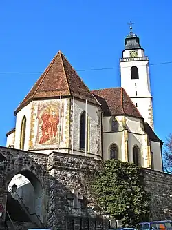 Die Saalkirche wurde nach dem Stadtbrand von 1725 anstelle einer dreischiffigen Basilika gebaut. Der Innenausbau war um 1762 vollendet. Die Kirche besteht aus einem Langhaus, dem Kirchturm an der Nordwand des Langhauses, einem eingezogenen, dreiseitig geschlossenen Chor im Osten des Langhauses, der Sakristei an seiner Nordwand und einer Kapelle an seiner Südwand, die beide von Strebepfeilern gestützt werden. Auf der Wandmalerei an der Stirnseite des Chors ist Christophorus dargestellt.