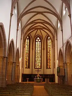 Im Innern entspricht die Raumaufteilung der Kirche des ersten Bauabschnitts. Vor 1851 war das Bauwerk nur bis zum zweiten Joch von Osten eingewölbt, das Mittelschiff nur bis zum ersten Joch. Der nach Westen flachgedeckte Raum wurde 1851 konsequent entsprechend dem ersten gotischen Bauabschnitt vereinheitlicht und eingewölbt. Im Langhaus sind spitzbogige Arkaden mit abgetreppten und abgefasten Bögen zu finden. Die Hochschiffwand ist ungegliedert und zeigt nur sehr kleine, hoch ansetzende Fensteröffnungen. Der Aufbau der Stützen entspricht fast noch den romanischen Formen mit weiten Bogenstellungen und einem quadratischen Pfeilerkern mit vorgelegten Halbsäulen. Zum Gewölbe hin steigen schlanke, vermutlich mittelalterliche Dienste auf. Die Kreuzrippengewölbe in den Seitenschiffen zeigen waagerechte, im Mittelschiff ansteigende Scheitel. Die Rippen sind abgeschrägt. Das Motiv der tellerförmigen, auskragenden Basen, die mit kleinen Konsolen mit dem Sockel verbunden sind, ist von der Bauhütte des Straßburger Münsters herzuleiten. Die Kapitelle in Kelchform sind mit Knospen- und Blattwerk geschmückt, nur diejenigen im Chor sind noch mittelalterlich.