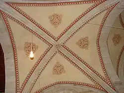 Die Ausmalung im vorderen Spitzbogen zeigt links den Petrus Apostel Petrus mit dem Kirchenschlüssel, rechts Johannes den Täufer mit dem Lamm. Im hinteren Bogen ist Christus, der Weltenrichter, in der Mandorla zu sehen – ein typisches Motiv der romanischen sakralen Malerei. Ihn umgeben Löwe, Stier, Mensch und Adler als Sinnbilder der vier Evangelisten.
