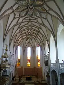 Der helle einheitlich gestaltete siebenjochige Saalraum geht nahtlos in das Chorpolygon über. Zwischen den tief eingezogenen Wandpfeilern sind hohe spitzbogige Nischen, die sich zu beiden Seiten des Langhauses über dessen gesamte Länge erstrecken. Den Wandpfeilern sind kannelierte Dienste mit genuteten Basen vorgelegt, auf denen ein Netzrippengewölbe ansetzt, das dem Tonnengewölbe appliziert ist. Das Netzrippengewölbe hat Scheitelschleifen und runde Schlusssteine aus der Mitte des 17. Jahrhunderts. Diese Schlusssteine zeigen Christus, ein Papstwappen im Chor, einen aufgemalten Reichsadler, einen Bindenschild, die heilige Maria und das Wappen von Norbert Bratis. Ein achtteiliger Scheitelstern mit Engels- und Heiligendarstellungen befindet sich im fünften Joch.