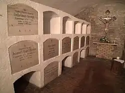 An der Nordseite der heutigen Sakristei gelangt man über einige Stufen zur gotischen Sakristei hinunter, die gemeinsam mit der gotischen Stiftskirche im letzten Viertel des 14. Jahrhunderts entstand. Das gotische Kreuzrippengewölbe, das Schlusssteine mit Vierblattrosetten und Efeublättern besitzt, ist weitgehend in der Originalform erhalten.[3]