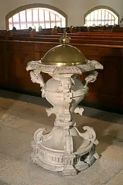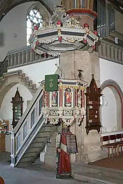 Kanzel und Taufbecken stammen aus der Barockzeit. Die Kanzel an einer Vierungssäule wird von einer Mosefigur gestützt.