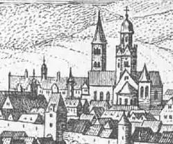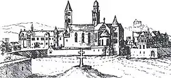 Stiftskirche um 1600. Kupferstich von Matthäus Merian, der eine Federzeichnung von Wilhelm Dilich zur Vorlage hatte.