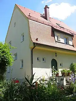 - Kreuzweg 4: Einfamilienhaus im Reformstil mit Mansarddach und typischen Landhausgarten, um 1905/10.