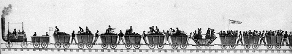 - ↑ Die Surrey Iron Railway südlich von London war 1801 die erste öffentliche Eisenbahn, 1804 zog eine Lokomotive einen Wagen in Merthyr Tydfil und 1812 nutzte die Middleton-Zechenbahn mehrere kommerziell; 1818 wurden Passagiere auf der Kilmarnock and Troon Railway befördert.