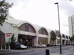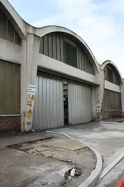 An der Vorderseite, zur Binfield Road, befinden sich drei seitwärts öffnende Segmenttore, die übrigen Gewölbe sind mit jeweils zwanzig vertikalen Fenstern versehen. An der zum Lansdowne Way gelegenen Seite der Halle haben das erste und das letzte Gewölbe Tore, die übrigen ebenfalls Fenster. Auch die Stirnseiten sind im oberen Teil großflächig verglast. Auf der Rückseite der Halle befinden sich in zwei ebenfalls in Stahlbeton ausgeführten Anbauten Büros, Sozial- und Werkstatträume.[4]