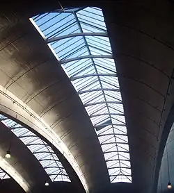 Die neun Tonnengewölbe zwischen den Trägerpaaren haben eine Breite von 12,80 Metern und sind auf der ganzen Länge mit mehr als vier Meter breiten Dachfenstern versehen. Von außen betrachtet sind die Pfeiler unter den Trägern als Strebwerk sichtbar, auf dem das geschwungene Dach aufliegt.