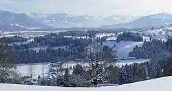 Panorama von Stoffels. Markant von links: Reuter Wanne, Breitenberg, Aggenstein, Grünten, Nebelhorn, Krottenkopf, Mädelegabel (37,8 km entfernt an der Grenze nach Tirol), Hohes Licht, Mittagberg und Nagelfluhkette bis zum Hochgrat