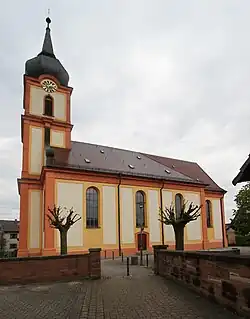 Die Barockkirche wurde im Jahre 1769 erbaut. Erbauer war Franz Ignaz Krohmer, badischer Hofbaumeister und Schüler von Balthasar Neumann. Diese Kirche trägt auf dem Zwiebelturm ein Patriarchenkreuz (Doppelkreuz) als Zeichen der 1632 zerstörten Mutterkirche St. Cyriak. Die barocke Innenausstattung der Kirche besticht schon beim Eintritt durch ihre feierliche Harmonie. Sehr aussagekräftig sind die vom Kirchenmaler Wagenbrenner im Jahre 1923 angebrachten Deckenbilder. Kaum noch lesbar ist die alte Grabplatte von 1348, die vor der Friedhofskapelle liegt. Auf der Empore der St.-Erhard-Kirche befindet sich eine Pfaff-Orgel in einem Gehäuse aus dem Jahr 1775 von Georg Hladky.[2]