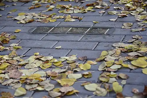 Weiters werden auch die Gedenksteine für NS-Opfer berücksichtigt, die den Demnig'schen Stolpersteinen nachempfunden sind. Sie unterscheiden sich jedoch von diesen in zumindest drei Aspekten: Sie sind deutlich größer (ca. 20 × 20 cm), die Inschriften wurden nicht von Hand gefertigt, es werden auch akademische Titel angeführt.