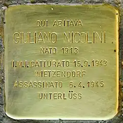 | HIER WOHNTE GIULIANO NICOLINI GEBOREN 1913 I.M.I. VERHAFTET 15.9.1943 WIETZENDORF ERMORDET 6.4.1945 UNTERLÜSS |