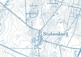 Nur als Ort wurde Stolzenburg am 11. November 1314 urkundlich genannt, als Johann und Konrad von Raven bekunden, dass sie an den Pfarrer von Papenburg Einkünfte aus 3 Hufen mit zwei Kossäten in „Stoltenborch“ (Stolzenburg) verkauft haben.[3] 1579 wurde die Feldsteinkirche von Stolzenburg erbaut. Damit wurde der Ort Kirchdorf und war auch als Bauerndorf ausgewiesen. Überliefert ist, dass seit 1669 ein ortsansässiger Halbbauer bereits Eigentümer dieses Hofes war. Die schwedischen Matrikelkarten von 1696 zeigen den Ort als von Süd nach Nord gestrecktes Straßendorf mit 13 Gebäuden, darunter die Kirche. Ein Krughof wurde bereits 1755 als Erbpacht registriert. Die 14 Voll- oder Ganzbauern erhielten die Erbpacht erst 1803, alle Höfe wurden dann 1836 als freies Eigentum gewandelt. Im preußischen Urmesstischblatt (PUM) von 1835 zeigt sich Stolzenburg als geschlossenes Straßendorf mit der Doppelreihe der Bauerngehöfte und der dazwischen angeordneten Katen. 1862 bestand das Dorf aus einer Doppelreihe von Massivhäusern. Darunter waren: Ein Küster- und Schulhaus, ein Armenhaus, ein Schäferhaus und 17 Landarbeiterkaten. An Wirtschaften waren registriert: 14 Ganzbauernhöfe, ein Halbbauernhof, ein Krughof mit angeschlossener Schmiede, 5 Büdner und 5 Halbbüdner sowie eine Holländerwindmühle. Insgesamt waren es 97 Wohn- und Wirtschaftsgebäude. Der Ort hatte 303 Einwohner in 66 Familien. 1871 hatte Stolzenburg 35 Wohnhäuser mit 52 Haushaltungen und 233 Einwohner, 1867 waren es noch 297. Alle waren Mitglied der evangelischen Konfession.[4] Die Messtischblätter (MTB) von 1880 und 1920 zeigen einige Bauernhöfe kompakter ausgebaut, aber sonst die Dorfstruktur unverändert. Das Güterverzeichnis von 1905 registriert 27 Wohngebäude mit 36 Haushaltungen sowie 178 Einwohner. 1914 waren nur noch 7 Bauern (Gaude, Jürgens, F. Laß, J. Laß, W. Laß, Schrötter und Tegge) gemeldet.