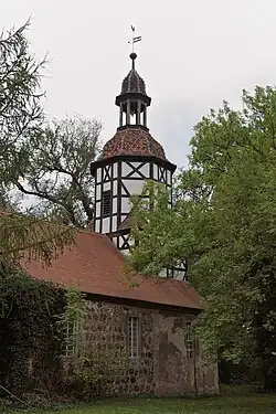 Auf der Nordseite des Lindenwegs in Ortsmitte steht die Dorfkirche, ein Feldsteinbau aus der Zeit um 1300. Herausragendes Ausstattungsstück ist ein spätgotischer Flügelaltar aus dem letzten Viertel des 15. Jahrhunderts. Neben der Kirche steht das Pfarrhaus, ein zweigeschossiger Putzbau mit Fachwerkstall, der um 1850 errichtet worden ist. Das Ensemble wird vervollständigt durch das zweigeschossige Schulgebäude aus dem letzten Viertel des 19. Jahrhunderts, das in Sichtziegelbauweise aufgeführt worden ist.[2]