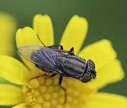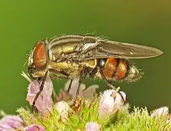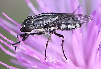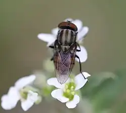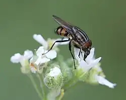 Die Fliegen sind 5–9 mm lang. Ihre Flügelspannweite liegt bei 13–16 mm. Die mittelgroßen Fliegen sehen gewöhnlichen Stubenfliegen auf den ersten Blick ähnlich, besitzen aber doch unverwechselbare Merkmale. Sie besitzen einen prominenten Proboscis (Saugrüssel). Über ihren Thorax und ihr Schildchen verlaufen markante schwarze Längsstreifen. Der Hinterleib weist bei den Männchen gelbe und schwarze Querbänder auf. An den Tergiten 3 und 4 sind bei den Männchen seitlich große orangefarbene Flecke erkennbar. Bei den Weibchen sind diese Flecke weniger auffällig in Grau gehalten. Bei den Männchen stehen die braunroten Facettenaugen eng aneinander – typisch für viele Fliegenarten. Sie weisen auf der unteren Hälfte irisierende Längsstreifen auf. Bei den Weibchen liegen die Augen weiter auseinander. Deren Facettenaugen weisen über der kompletten Fläche der Augen irisierende Längsstreifen auf.